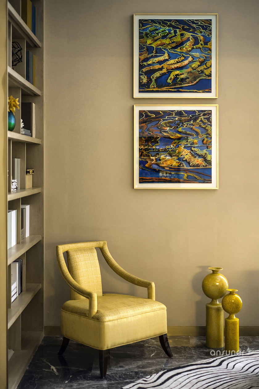 聚会厅的空间中,温润的黄翡色泽介入,材质的混搭与精致的工艺形成一场精心的铺排,简洁有力的设计语言,抽象的艺术画与精致雅趣的饰品在同一空间并置。