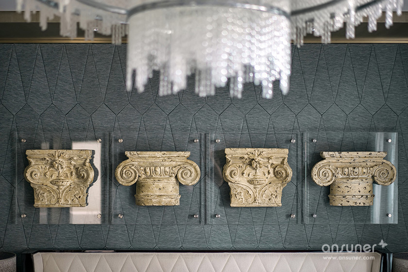 主卧的设计中,安博anbo(中国)将古旧粗犷的古罗马建筑元素提炼成了床头的艺术装置,用精巧的方式将宏大的叙事载入空间,克制的色系与浪漫的表达形成了东方和西方的对话。