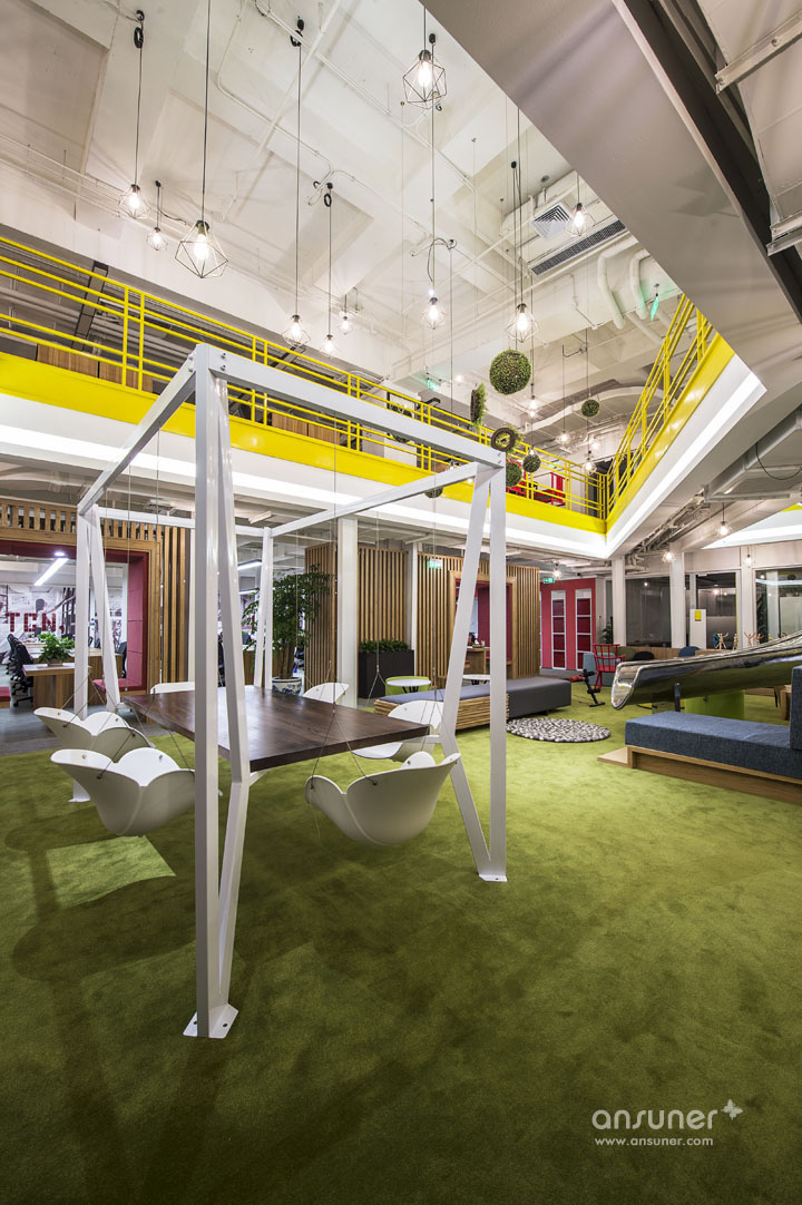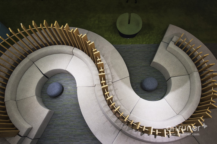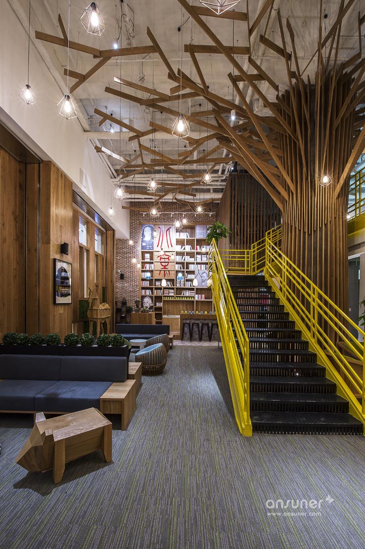 大量原生态木板、绿植墙的采用使整个空间接近原生态,营造出轻松、休闲的办公环境。过去毫无装饰白色承重柱,也被木制进行包裹,演化成了一个参天大树,给人大树底下好乘凉的感觉,树木象征着生长,万物欣欣向荣充满生命力。树枝向天花板伸展开来,一个个树屋垂挂其中将单调天花板加入了自然的生气。