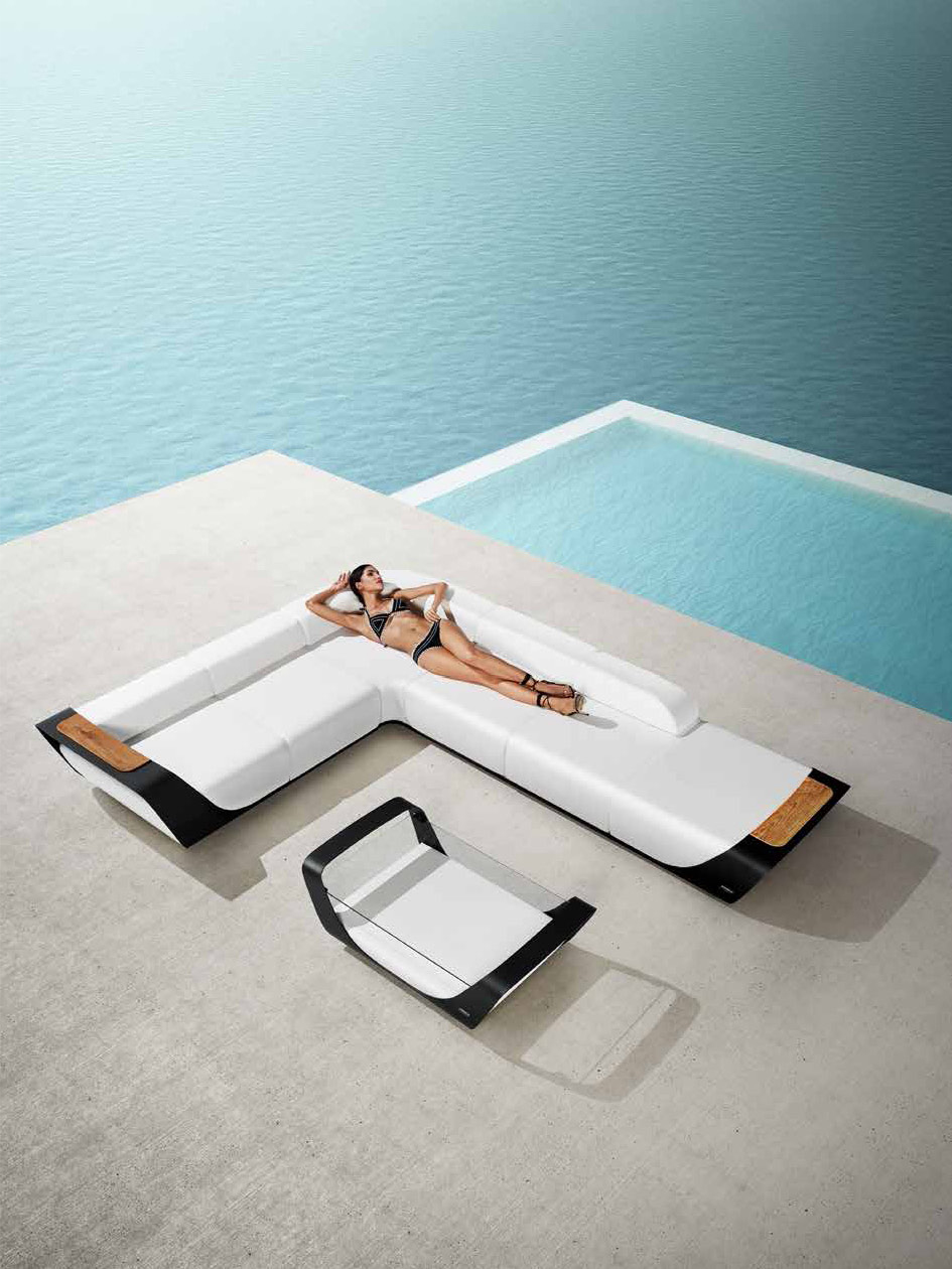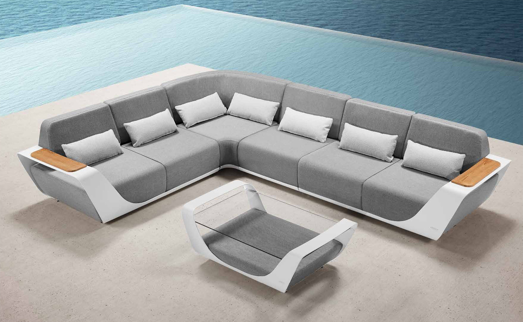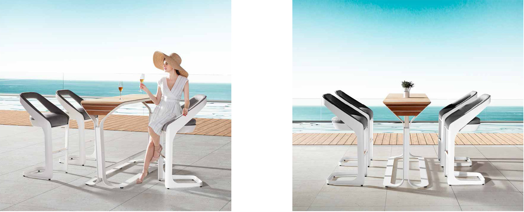 设计灵感:动感的海浪 “奢华”---奢华原创独一无二 “革新”---6mm铝板整体成型和无缝焊接+TIGER牌喷粉+纯天然A级缅甸柚木,搭配顶级环保用材,技术革新 “优美”---游艇SUNBRELLA 布艺,超厚快干棉异形切割,体现完美形态,满足全天候的户外条件 “多变”---30多种搭配组合,精选3种主流颜色,室内室外搭配随心所欲 “细致” ---防水布罩,多功能卡扣,防霉里布,蜂窝纸箱,细致入微,解决您的后顾之忧